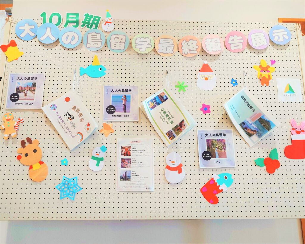 12月16日~1月9日『10月期大人の島留学最終報告』展示のお知らせ 2025/12/16 (火) お知らせ 12月16日より『10月期大人の島留学最終報告』の展示をしています。 令和7年10月から3ヶ月間、西ノ島町で過ごした3人の島留学生による島での取り組み、暮らしや学びをまとめています。 ぜひご覧ください。 <展示場所> 土間 <展示期間> 12月16日~1月9日