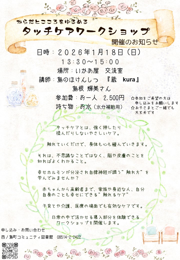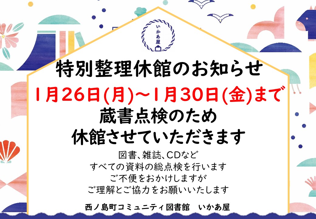 2026/01/10 (土) 特別整理休館のお知らせ 2026/01/10 (土) 1月新着図書のお知らせ 2026/01/6 (火) タッチケアワークショップのお知らせ 2026/01/6 (火) 『おみくじ付ブック』『おたのしみふろくプレゼント』のお知らせ 2026/01/5 (月) 明けましておめでとうございます🐎✨ 2025/12/22 (月) 12月27日『小さな音楽会』のお知らせ 2025/12/16 (火) 12月16日~1月9日『10月期大人の島留学最終報告』展示のお知らせ 2025/12/15 (月) 『アルコールとタバコ』啓発展示のお知らせ 2025/12/14 (日) 年末年始休館日のお知らせ 2025/12/12 (金) 12月新着図書のお知らせ 1 2 3 4 5 6 … 28 >