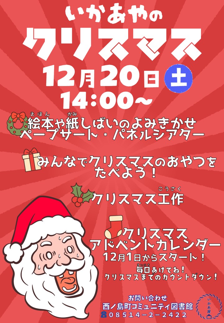 2025/12/1 (月) クリスマスおはなし会 2025/12/1 (月) 縁側カフェ 2025/12/1 (月) 移動図書館【別府】 2025/12/1 (月) 移動図書館【物井】【大山】 2025/12/1 (月) 移動図書館【大津】【珍崎】 2025/12/1 (月) おえかきの日 2025/12/1 (月) 出張おはなしのへや 2025/11/23 (日) 絵本のおやつをみんなで作ってみよう!(読書週間イベント) 2025/11/9 (日) いかのワークショップ 2025/11/9 (日) よるのブックカフェ 1 2 3 4 5 6 … 44 >