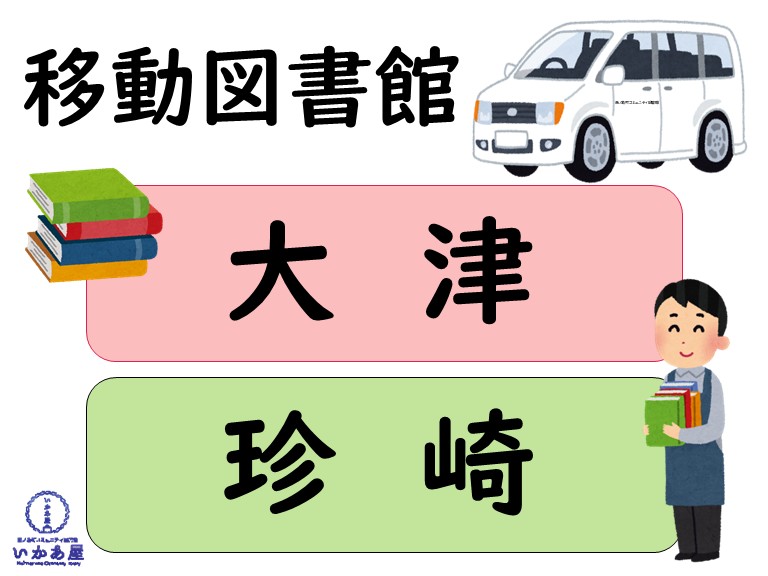 移動図書館【大津】【珍崎】 2026/04/2 (木) 開催日: 2026年4月23日 10:30 - 14:30カテゴリー: その他 大津 場所:大津集会所 時間:10:30~11:15 珍崎 場所:珍崎公会堂 時間:13:30~14:30