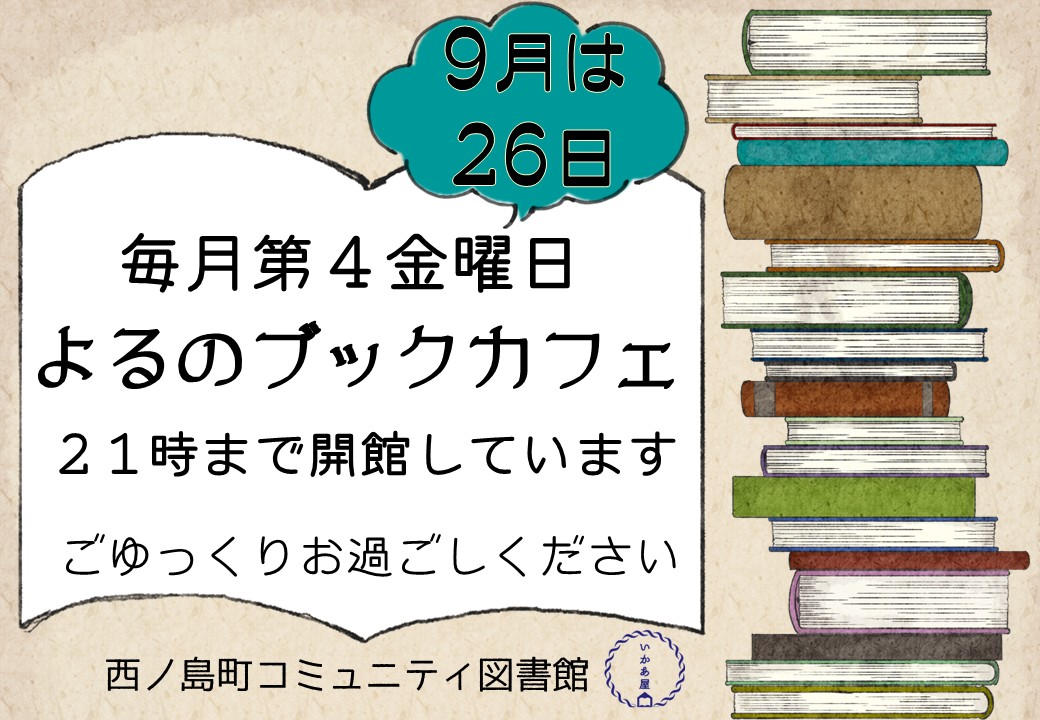 2025/10/12 (日) よるのブックカフェ 2025/09/28 (日) 読書週間イベント☆ひとはこ館長募集します! 2025/09/17 (水) よるのブックカフェ 2025/08/2 (土) よるのブックカフェ 2025/07/22 (火) 7周年 2025/07/7 (月) よるのブックカフェ 2025/06/1 (日) よるのブックカフェ 2025/05/4 (日) よるのブックカフェ 2025/05/3 (土) 2025いかあやフェス(5/18更新) 2025/04/3 (木) こども読書イベント 1 2 3 4 5 6 … 9 >