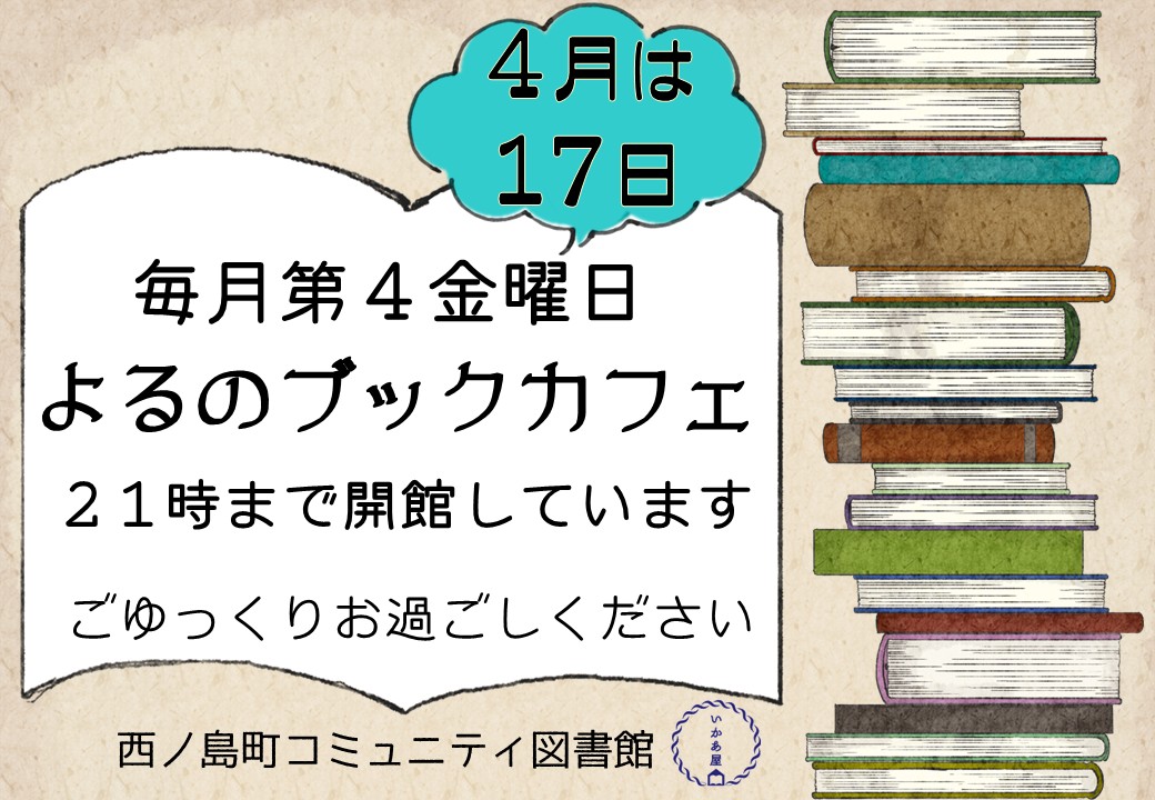2026/04/2 (木) よるのブックカフェ 2026/03/19 (木) 2026いかあやフェス 2026/03/2 (月) よるのブックカフェ 2026/02/1 (日) よるのブックカフェ 2026/01/4 (日) よるのブックカフェ 2025/12/13 (土) よるのブックカフェ 2025/11/9 (日) よるのブックカフェ 2025/10/12 (日) よるのブックカフェ 2025/09/28 (日) 読書週間イベント☆ひとはこ館長募集します! 2025/09/17 (水) よるのブックカフェ 1 2 3 4 5 6 … 10 >