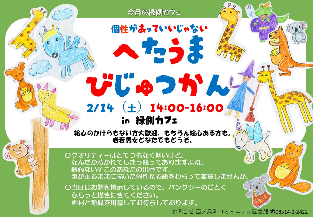 2026/02/1 (日) 縁側カフェ 2026/01/4 (日) 縁側カフェ 2025/12/1 (月) クリスマスおはなし会 2025/12/1 (月) 縁側カフェ 2025/11/3 (月) 縁側カフェ 2025/10/5 (日) 縁側カフェ 2025/10/3 (金) 大人のおはなし会(読書週間イベント) 2025/09/17 (水) 縁側カフェ 2025/09/5 (金) 哲学カフェ 2025/08/2 (土) 縁側カフェ 1 2 3 4 5 6 … 8 >