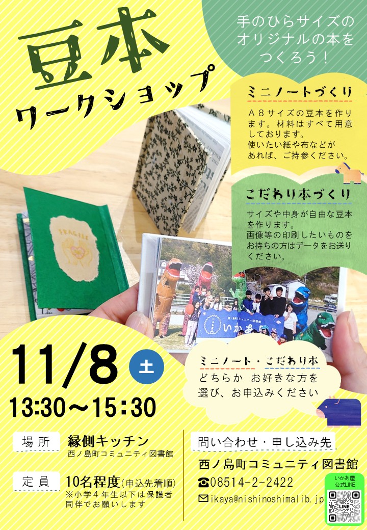 2025/10/15 (水) 豆本ワークショップ(読書週間イベント) 2025/07/7 (月) 縁側カフェ 2025/03/1 (土) アロマスプレーワークショップ 2024/12/4 (水) 縁側カフェ 2024/11/20 (水) 縁側カフェ 2024/10/31 (木) 島前高校生企画イベント 2024/10/18 (金) みつろうラップづくり 2024/09/7 (土) 縁側カフェ 2024/05/9 (木) いかあ屋フェス2024(5/24追記) 2023/12/1 (金) ボードゲーム広場 1 2 3 >